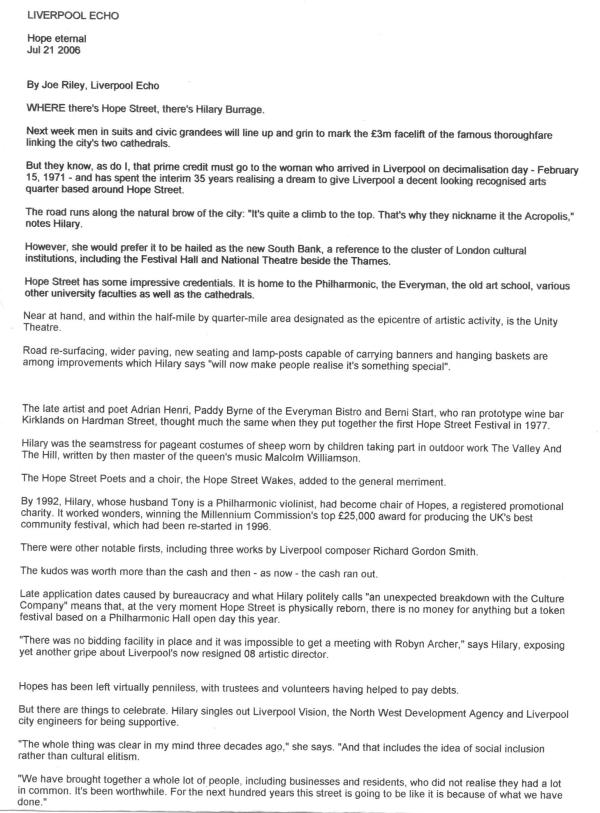 Ten years ago today Joe Riley, then Arts Editor of the Liverpool Echo, wrote a piece about HOPES: The Hope Street Association and my role in the regeneration of the Hope Street Quarter. We started with a huge threat to the big arts organisations in the city and the slogan ‘Once lost we will not get it back‘ , and moved on to become a thriving cultural quarter that had until quite recently been a backwater.