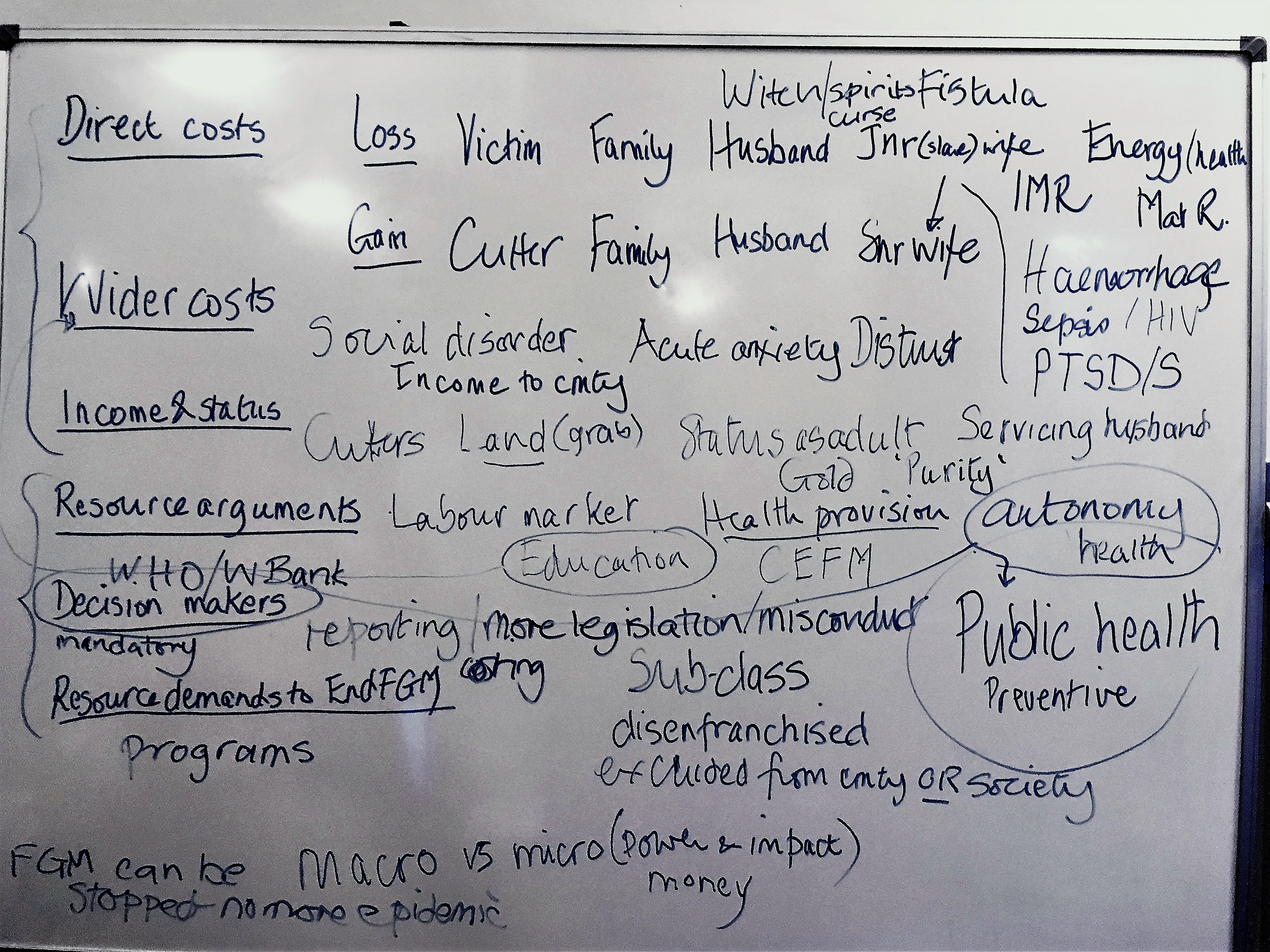 Friday 8 March 2018 saw another EndFGM seminar led by Dr Tobe Levin and hosted by Dr Maria Jaschok of the International Gender Studies Centre, Lady Margaret Hall, University of Oxford. The event was attended by academics (two from the USA), doctors, lawyers and activists. I contributed by leading an interactive session on the many economic aspects – still so often overlooked – of female genital mutilation and its eradication. My briefing paper (drawing on the event concept note Tobe Levin had prepared) follows below, with a visual record of our discussions: