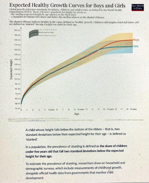 A chart, sourced from the World Health Organisation and designed by Our World in Data, shows how children grow, and at what point / measurement their growth becomes stunted and a matter of concern: