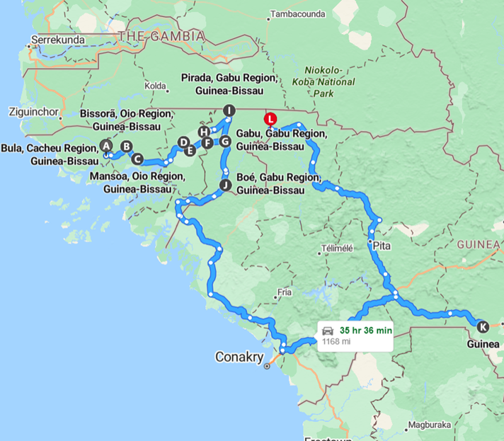 The ‘Caravan’ is an actual bus or similar which travels between strategically selected venues in a given country. This is the route for Guinea Bissau: