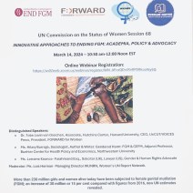 Today I joined my friends and colleagues Dr Tobe Levin and Lorraine Koonce-Farahmand Esq to deliver a session of the Commission on the Status of Women (CSW68), the theme of which this year is “Accelerating the empowerment of all women and girls by addressing poverty and strengthening institutions and financing with a gender perspective”. The title of our presentation, chaired by Ms Lois Herman of WUNRN, was ‘Innovative Approaches to Ending FGM: Academia, Policy and Advocacy’. My topic was Can practical ‘developments’ in socio-economic contexts help end FGM?