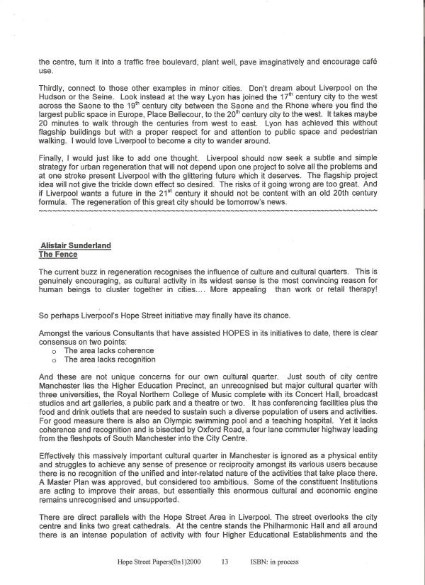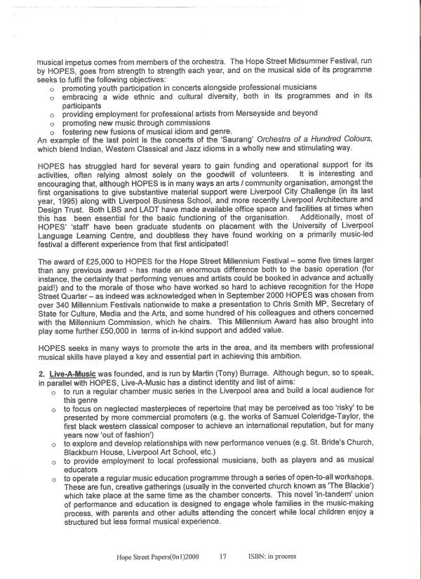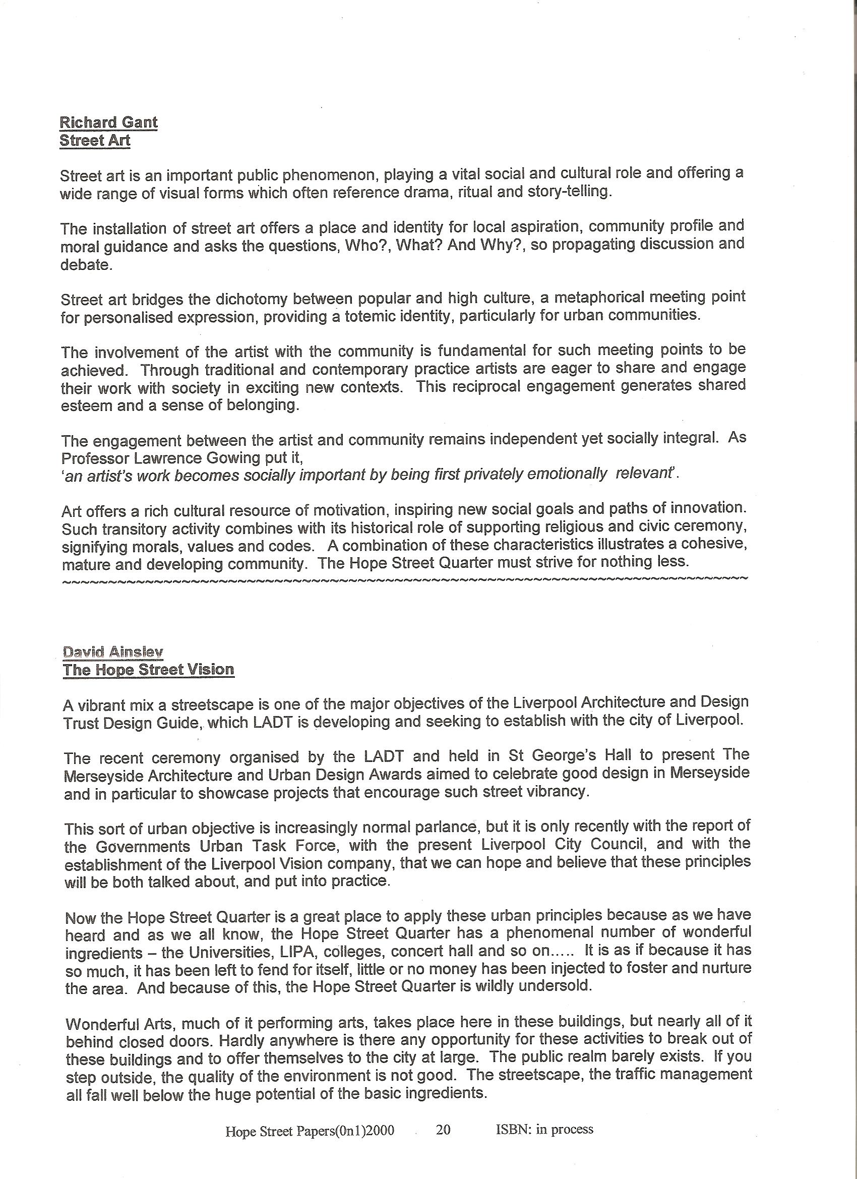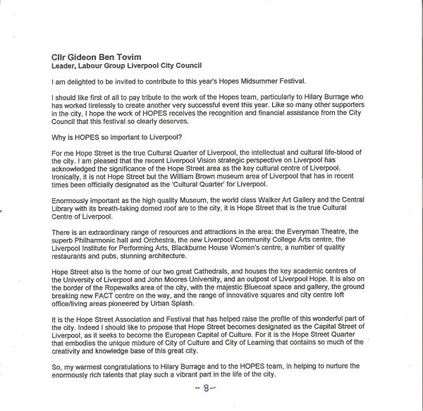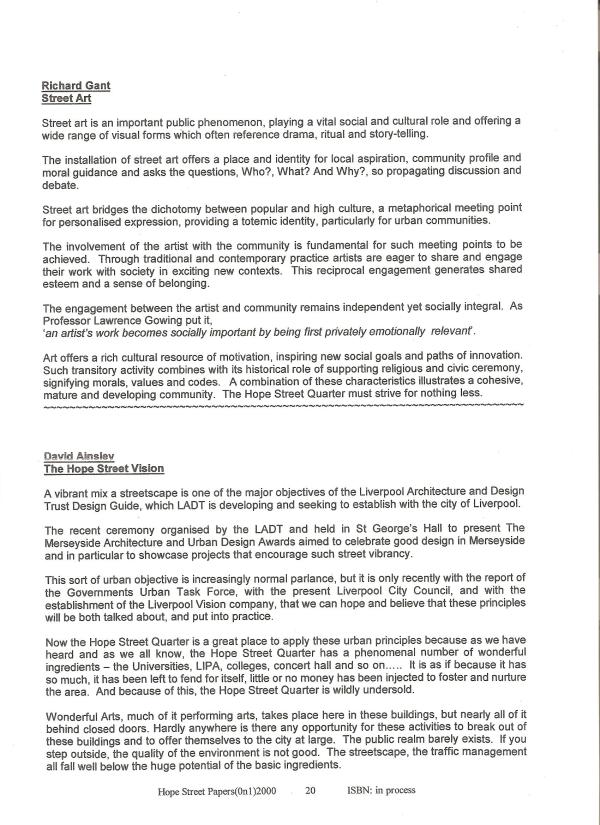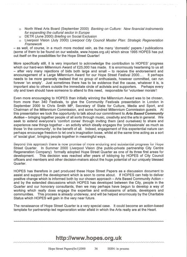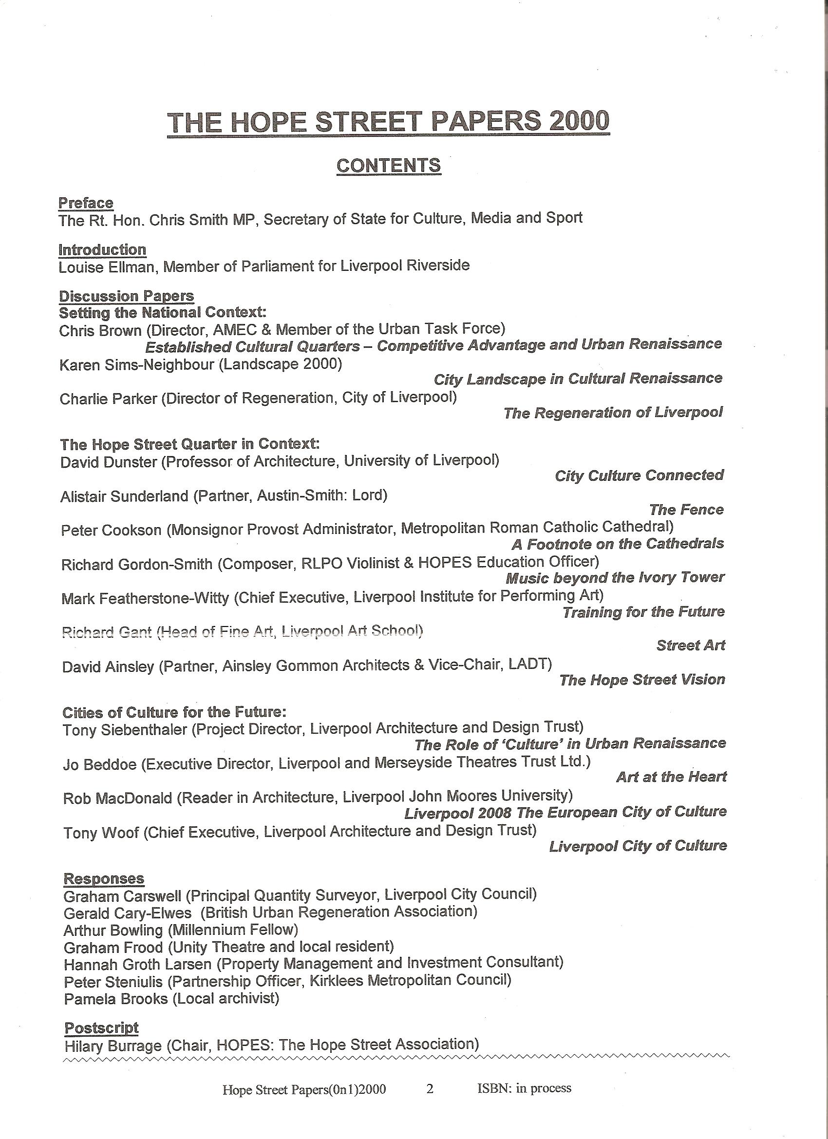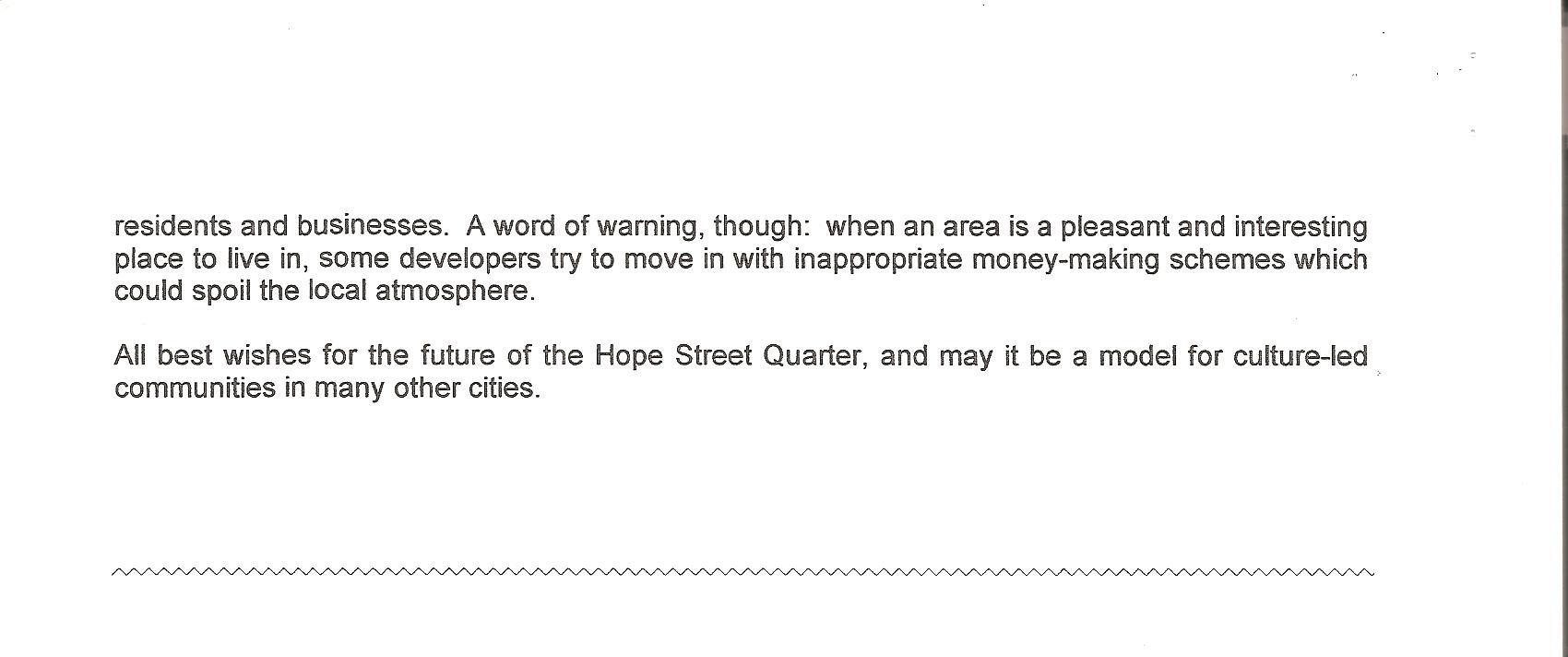 Their efforts led to the development of the Hope Street Papers in 2000 (www.hilaryburrage.com/the-hope-street-papers-1999-2001/) which laid the groundwork for the development of the area. HOPES also developed these proposals via the dozen annual Hope Street Festivals – the HOPES Millennium Festival was chosen by the Millennium Commission as their national exemplar – and many other community engagement and stakeholding events which the charity created and delivered.