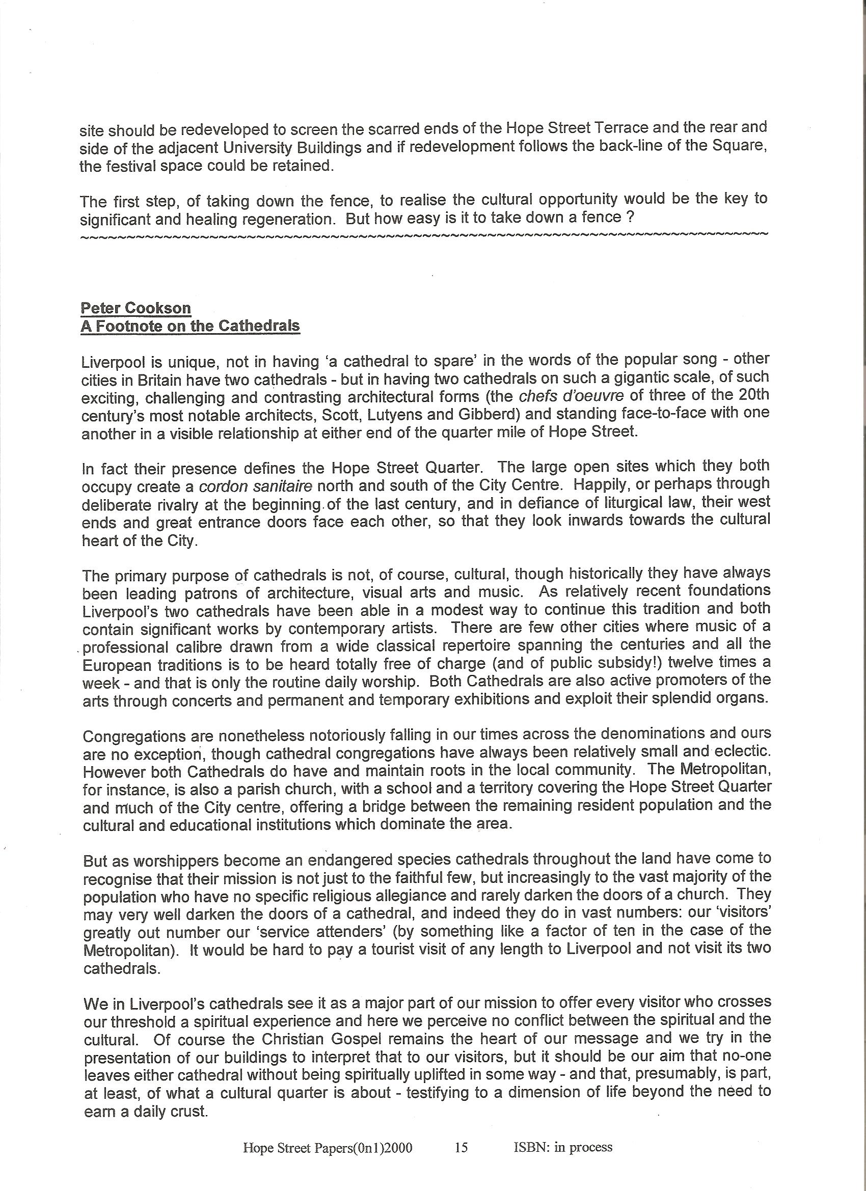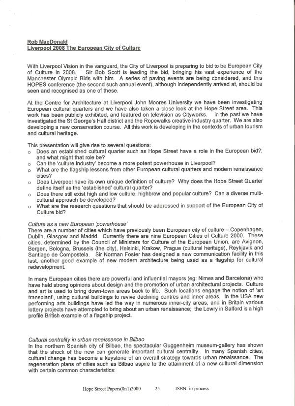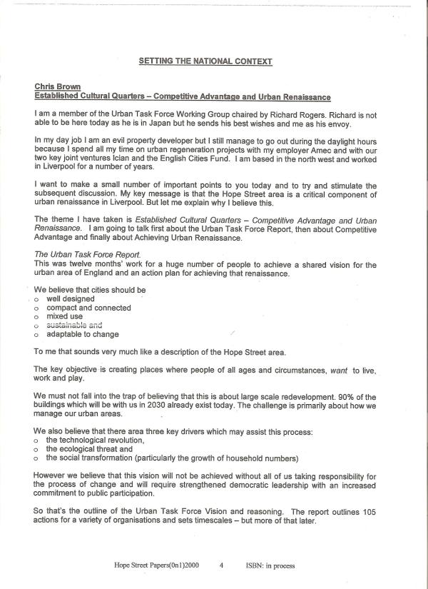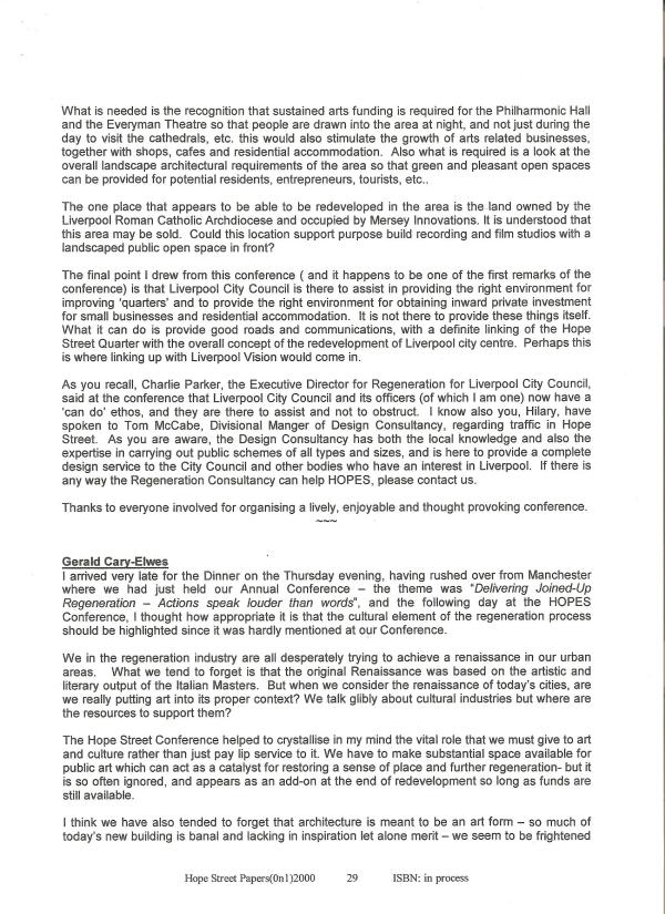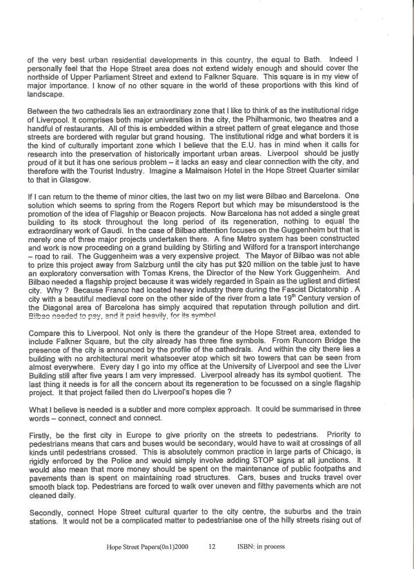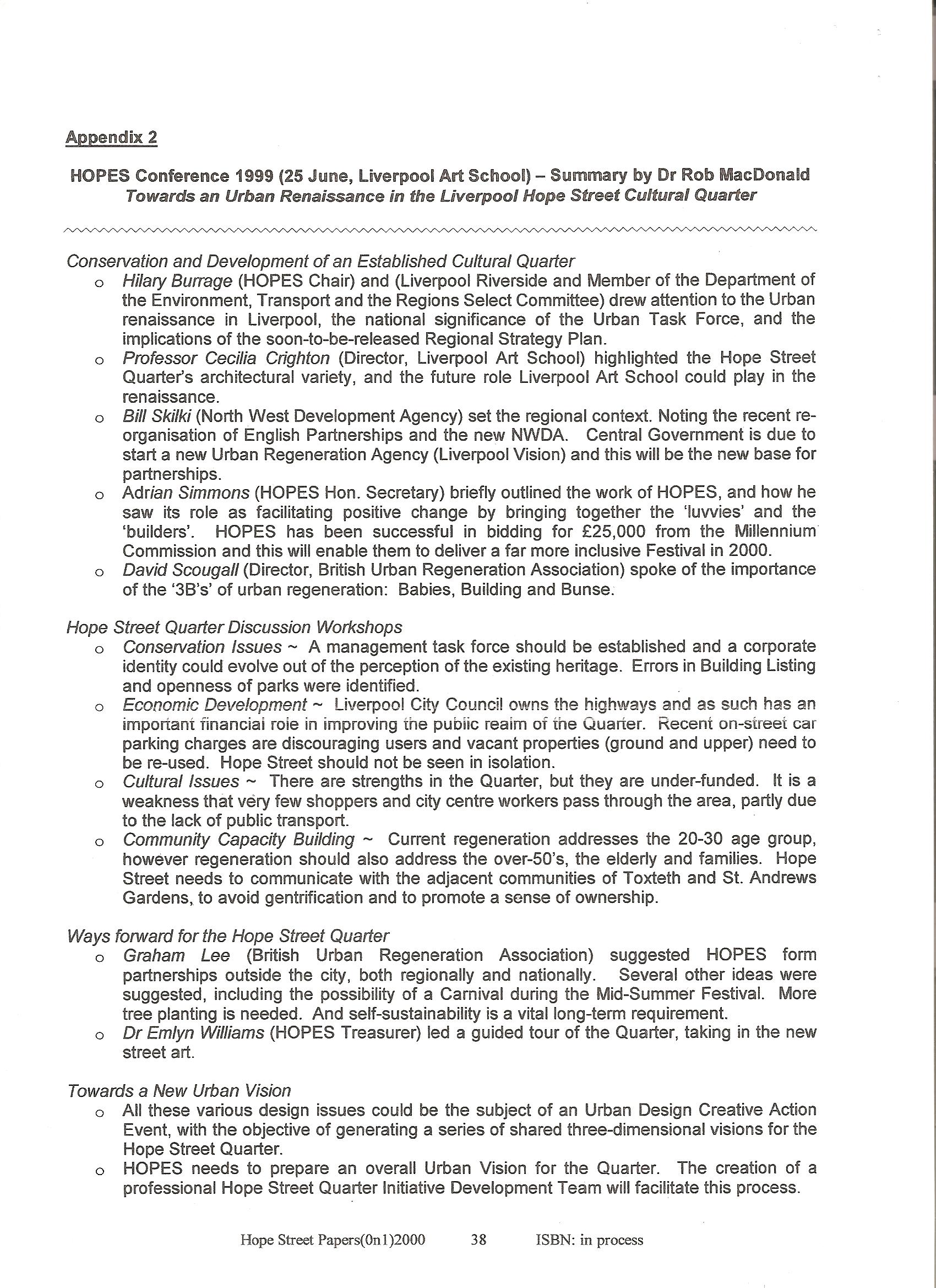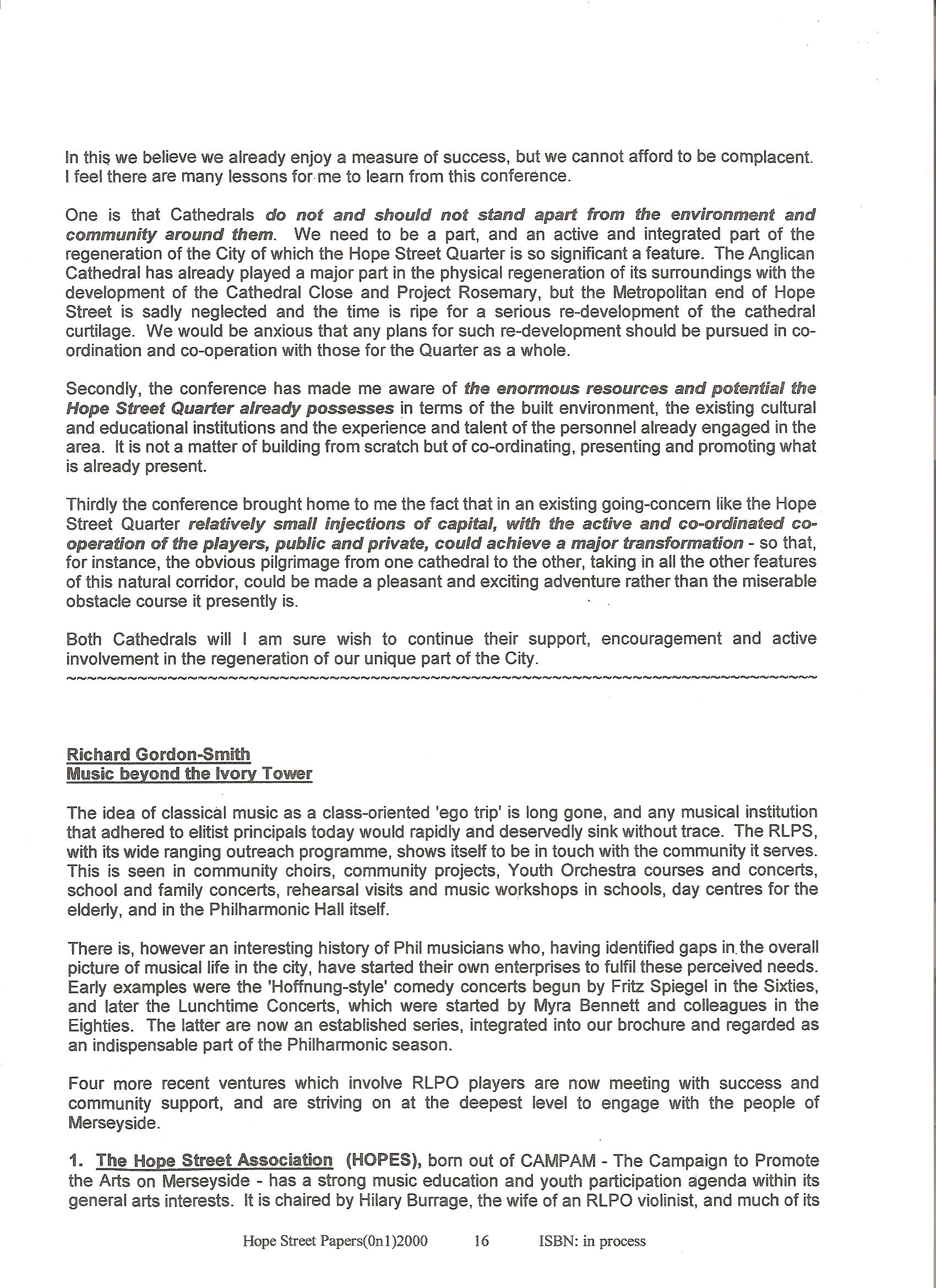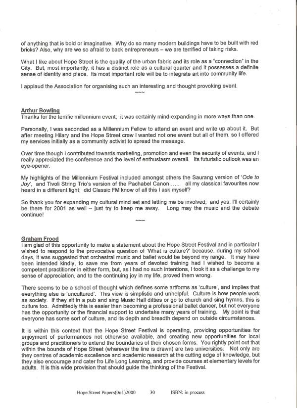 Their efforts led to the development of the Hope Street Papers in 2000 (www.hilaryburrage.com/the-hope-street-papers-1999-2001/) which laid the groundwork for the development of the area. HOPES also developed these proposals via the dozen annual Hope Street Festivals – the HOPES Millennium Festival was chosen by the Millennium Commission as their national exemplar – and many other community engagement and stakeholding events which the charity created and delivered.